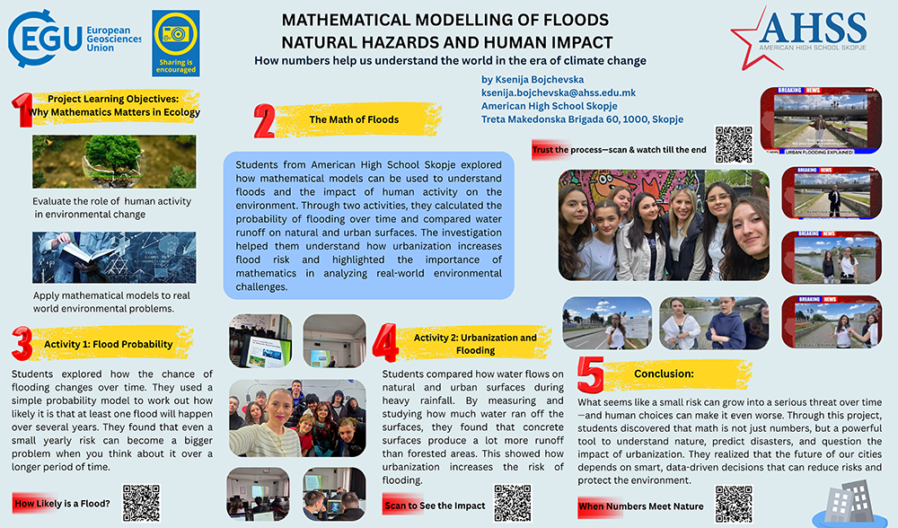 Teacher Bojchevska will present her poster, “Mathematical Modelling of Floods: Natural Hazards and Human Impact – How numbers help us understand the world in the era of climate change.”
