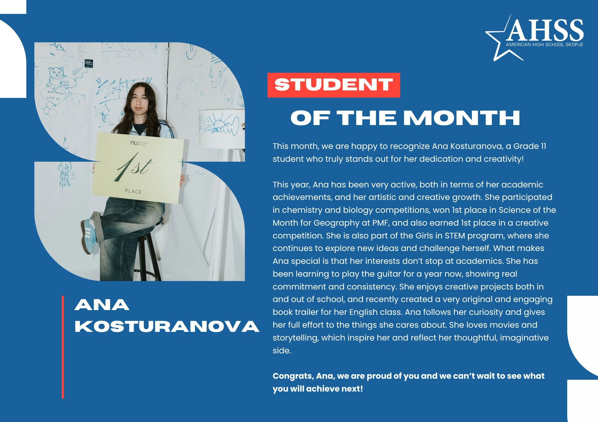 We’re happy to announce that we dedicate the month of February to our Ana! She stands out for her dedication, curiosity and creativity. From academic achievements to artistic projects, she gives her best in everything she does. 🎓✨